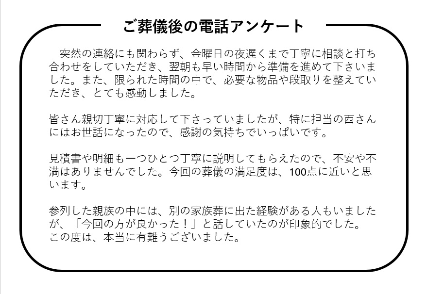 見積書や明細も一つひとつ丁寧に説明してもらえたので、不安や不満はありませんでした。今回の葬儀の満足度は、100点に近いと思います。